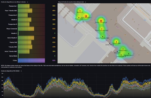 • Dashboards de analítica en Grafana: visualización en tiempo real de ocupación por zonas, rutas más frecuentes y tiempos de permanencia.